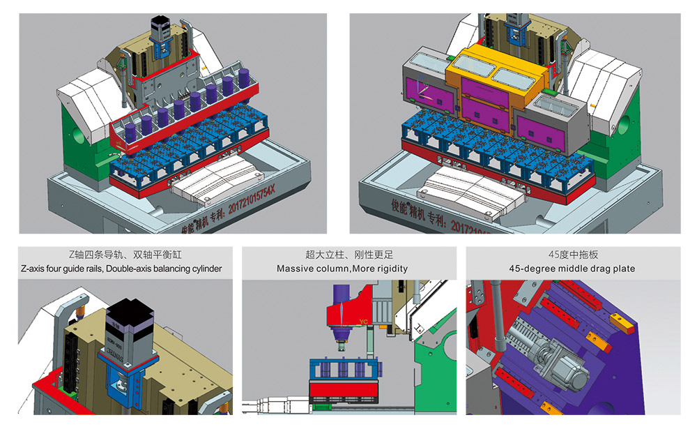 Machien JN-D8标配SYNTEC系统。用户可以选择西门子或三菱系统。新一代模型优化了每个轴的加速特性,实现了高速、高精度和高质量的表面处理。采用滚动导轨,有效控制机床的稳定性和刚度。该机器采用大理石矿物铸造体,高效、稳定、不变形。目前,它是国内外市场上第一台大型矿物铸造精雕设备。